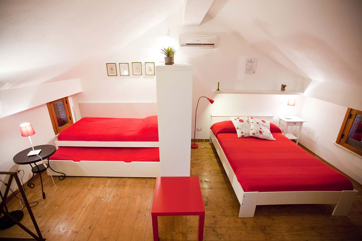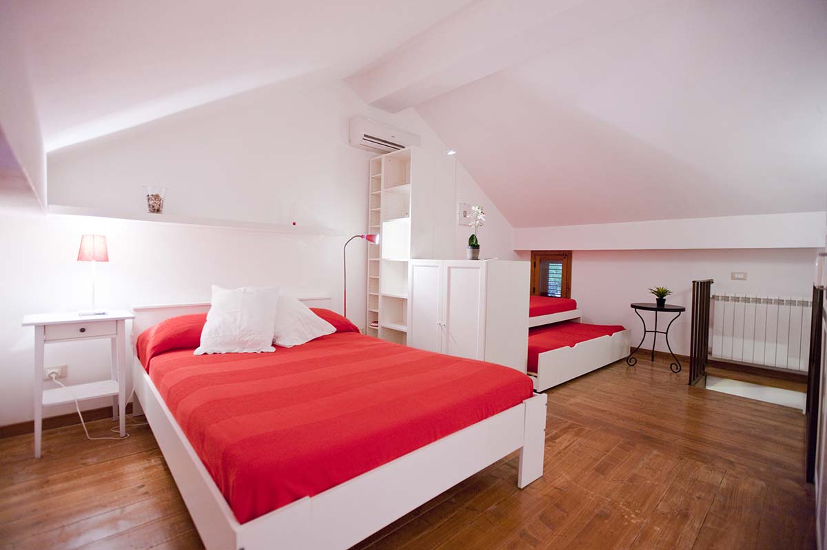 - Ampia stanza da letto al primo piano capace di 4 posti, separati da elementi divisori:1 letto matrimoniale e 2 letti singoli.