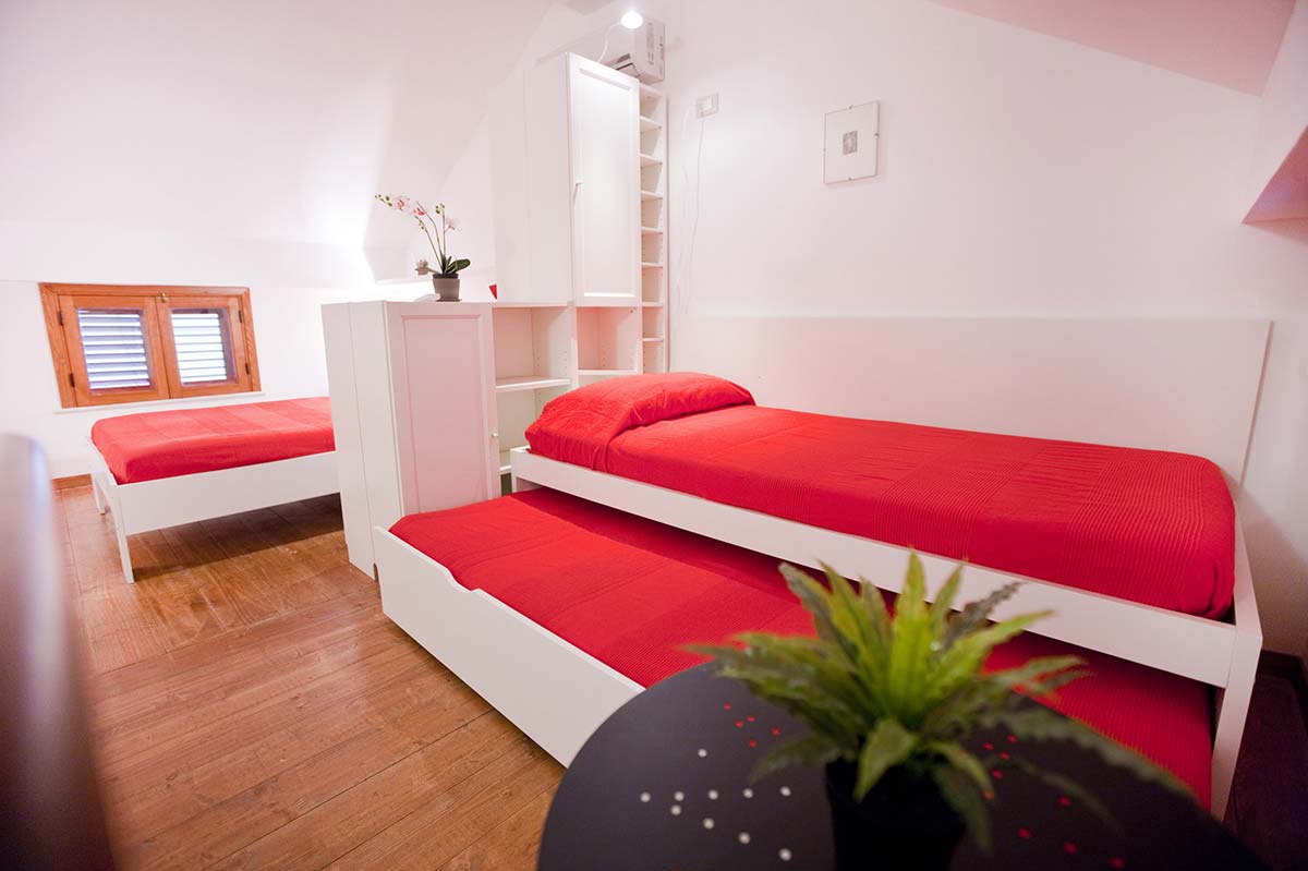 - Ampia stanza da letto al primo piano capace di 4 posti, separati da elementi divisori:1 letto matrimoniale/ 2 letti singoli.