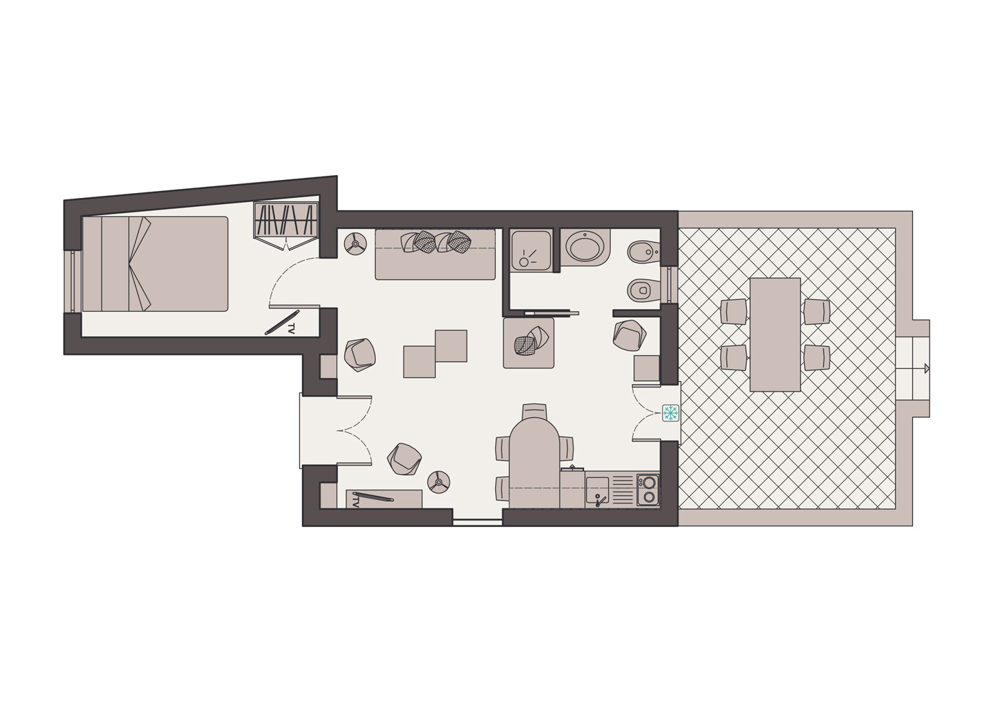 - Soggiorno con mini cucina (2 piastre elettriche), forno a microonde, lavello, piccolo frigorifero, macchina per caffè, thè e cappuccino, stoviglie, televisione, asse e ferro da stiro, aria condizionata, riscaldamento, Kit cortesia.